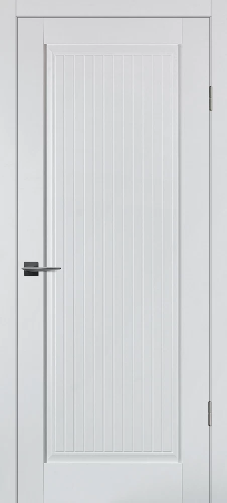 Царговое полотно, выполненное в гладком матовом покрытии, приятным на ощупь, обладающее высокими эксплуатационными характеристиками. Бескромочная технология. Полотно комплектуется объемной филенкой с фрезерованным рисунком "под рейку". В остекленных полотнах используется рифленное стекло с красивым прокатным узором в виде полос. Отлично смотрится в неоклассических и лофтовых интерьерах.