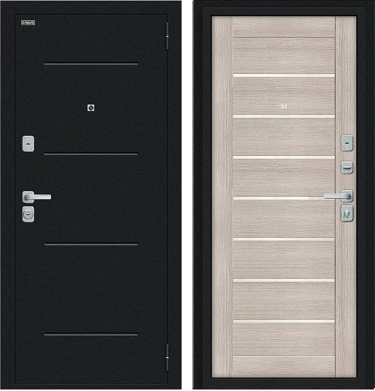 Надежная входная Дверь Браво Техно/BChrome Букле черное/Cappuccino Melinga премиум класса по цене 33 231 руб. Большая толщина стали защитит от проникновения в ваш дом, квартиру или коттедж. Используется очень качественная фурнитура: замки, цилиндры, ручки, защелки. Покрытие и отделка двери изготовлено под внимательным контролем производителя. Дверь имеет долгий срок службы и гарантию.